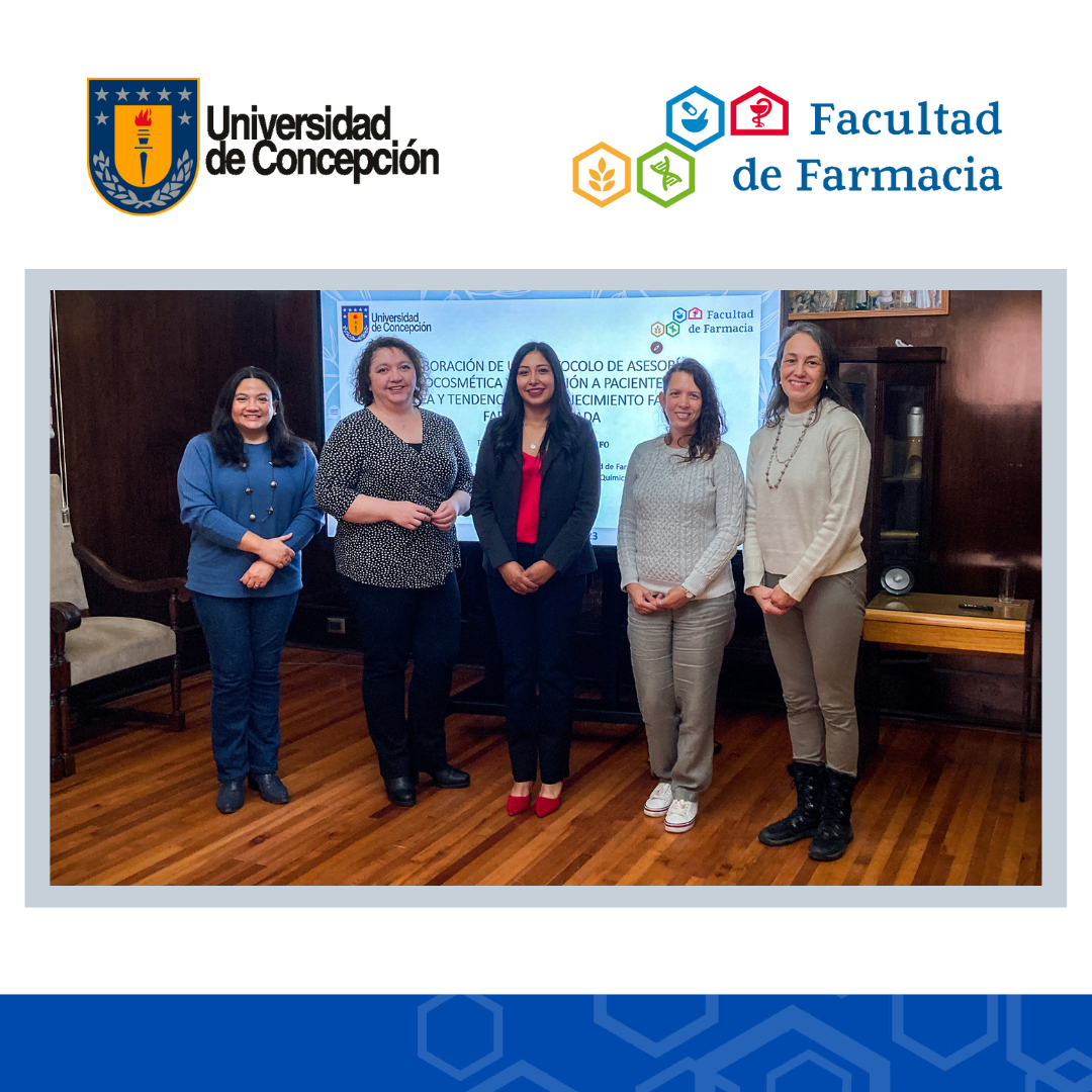 Glenda recibió su título profesional de Químico Farmacéutico de la Universidad de Concepción, luego de presentar y defender su Examen de Título, el cual se denominó «Elaboración de un protocolo de asesoría dermocosmética y educación a pacientes con rosácea y tendencia al enrojecimiento facial en farmacia privada».