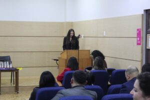 La directora del Magíster, profesora Constanza Mosso Corral, tomó la palabra para hacer entrega de los certificados a Camila Ortega Navarrete y Luciana Morales Campos.
